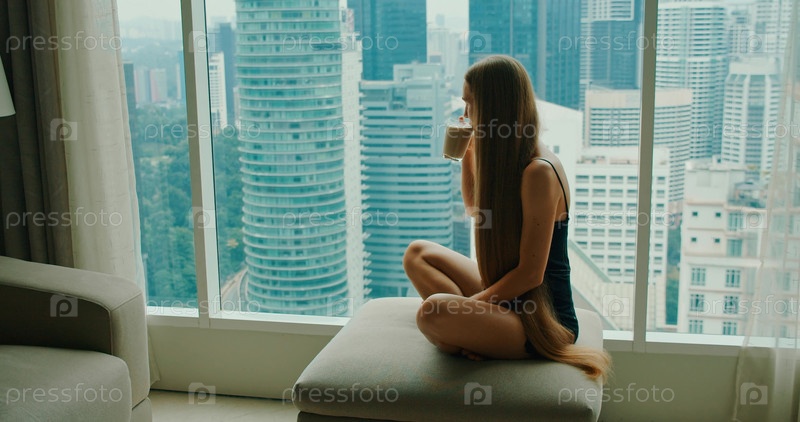 Молодая женщина сидит дома на диване и смотрит в окно и пьет горячий кофейный напиток. Замедленная съемка. Одинокая длинноволосая девушка