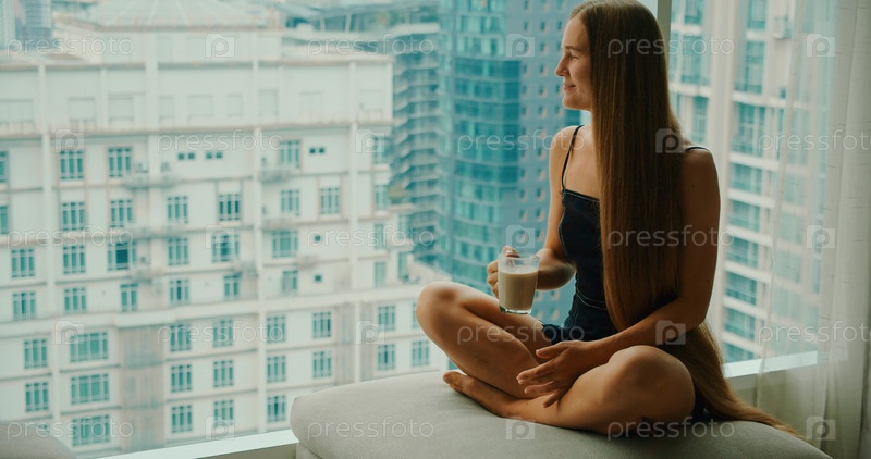 Молодая улыбающаяся женщина пьет вкусный кофе возле окна с небоскребами большого города снаружи. Расслабленная девушка наслаждается утренним капучино на выходных в мегаполисе. Замедленная съемка крупным планом