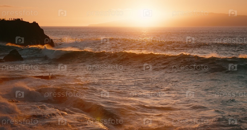 Свет заката Годена отражается на бурных океанских волнах на скалистом побережье. Пена морской воды разбивается в замедленной съемке. Тенерифе