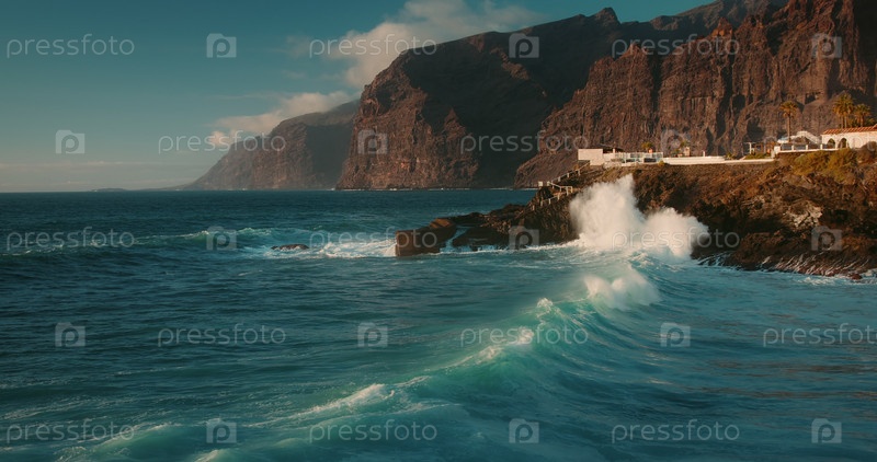 Большие океанские волны разбиваются о черные вулканические скалы на берегу острова Тенерифе. Голубая волна воды яростно плескается по скалистому берегу