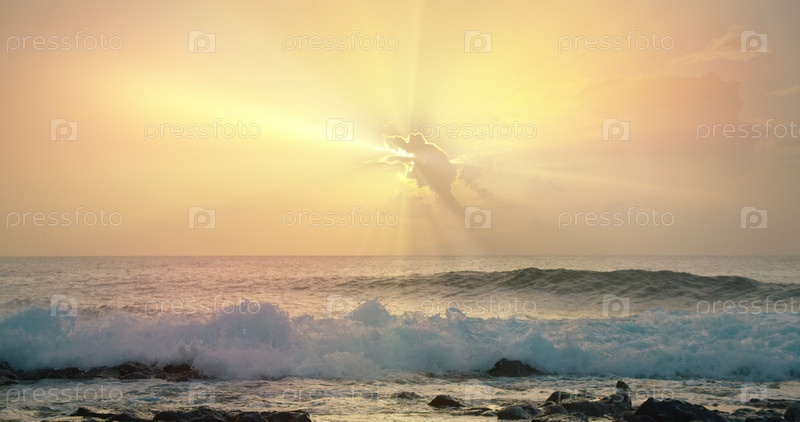 Лучи Бога освещают океанские волны сквозь облака на ясном небе. Бурное взволнованное море на фоне заката с величественным солнечным светом. Бурные огромные морские волны разбиваются о берег и высоко летают брызги. Волшебный солнечный свет