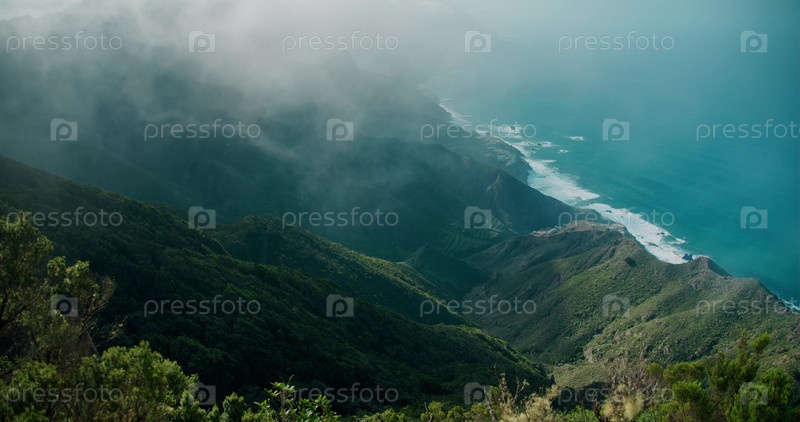 Густые туманные облака спускаются по горному ландшафту на побережье океана. Кинематографический морской пейзаж, вид сверху вниз