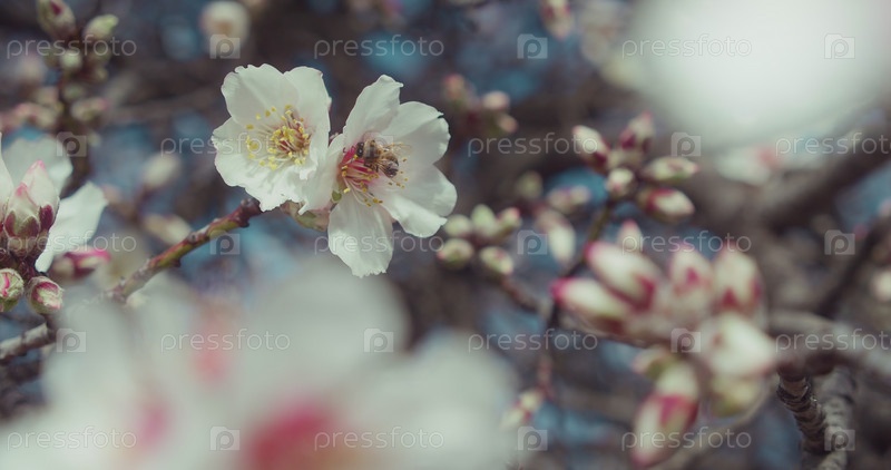 Пчела собирает пыльцу с цветков миндаля на цветущем дереве на фоне голубого неба. Белые цветы в саду крупным планом