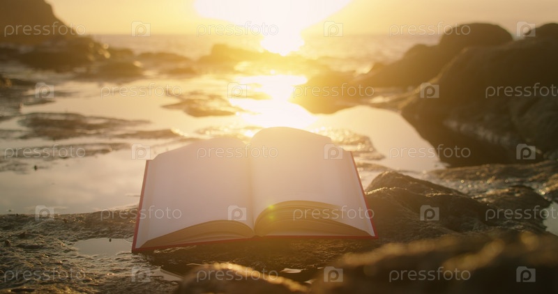 Открытая книга крупным планом и яркий закатный свет. Концепция обучения чтению. Кинематографический волшебный океанский пляж. Священные Писания Святая Библия