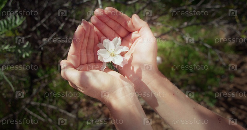 Женские руки заботятся об окружающей среде. Наслаждаемся цветущей природой, трогаем цветы деревьев весной. Цветы миндаля