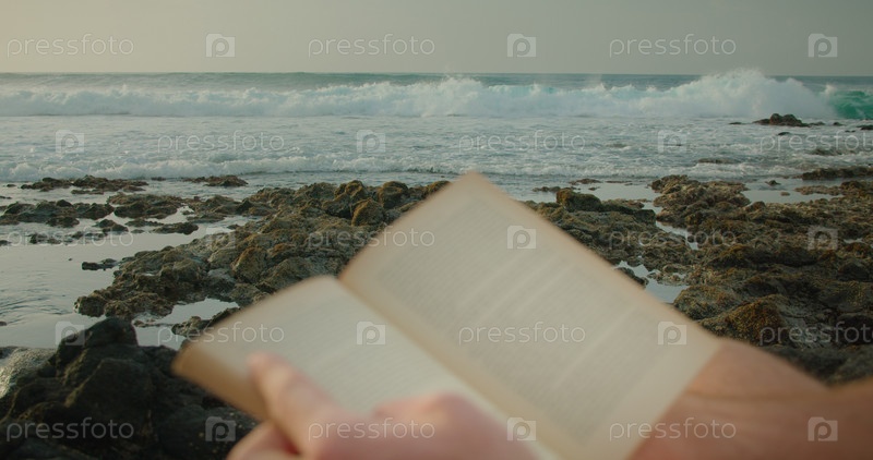 Большие бурные океанские волны катятся по каменистому пляжу, пока мужчина отдыхает и читает книгу