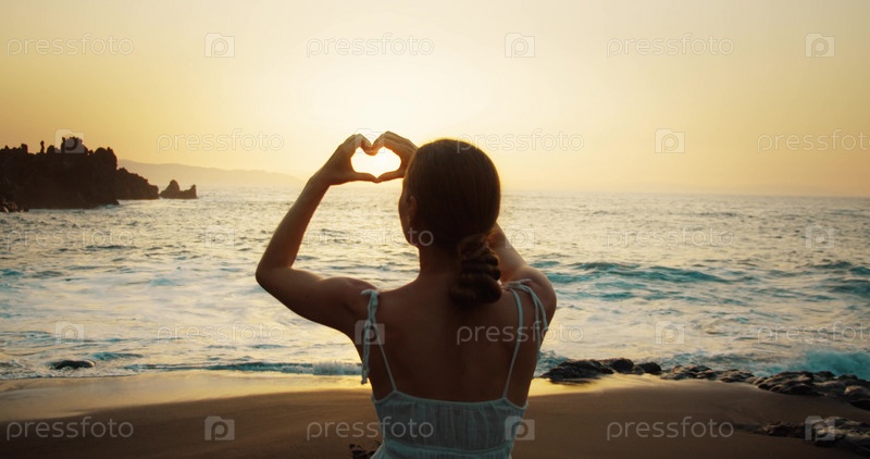 Женщина на пляже показывает символ сердца руками на золотом закате. Мечта путешественников о летнем отдыхе. Солнечный свет между пальцами. Средневзрослый человек, вид сзади, замедленное движение крупным планом