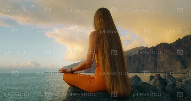 Красивый длинноволосый силуэт взрослой девушки на море на закате. Женщина занимается йогой и медитирует в позе лотоса на скалистом пляже океана
