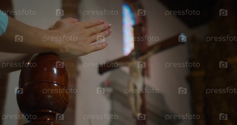 Крупный план молитвенной руки на фоне креста с распятым Иисусом Христом Искупителем. кинематографическое видео высокого качества в формате 4K