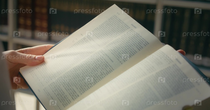 Крупным планом женские руки держат и читают книгу Библии в публичной библиотеке. Богослов изучает мировую историю. Ищите истину
