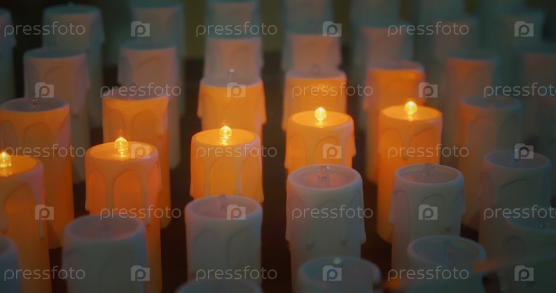 Электрические свечи в современной католической церкви. Золотое сияние искусственного огня крупным планом. Концепция религиозной веры