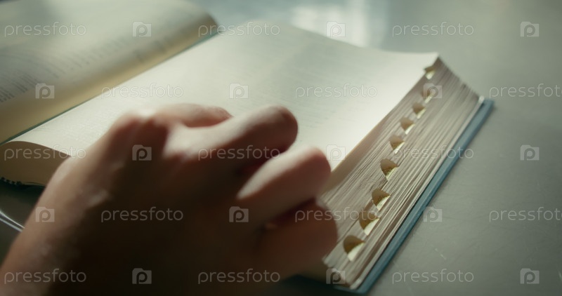 Молодой человек читает книгу дома. Руки крупным планом на страницах бумажной книги. Знания во время карантинной жизни без Интернета