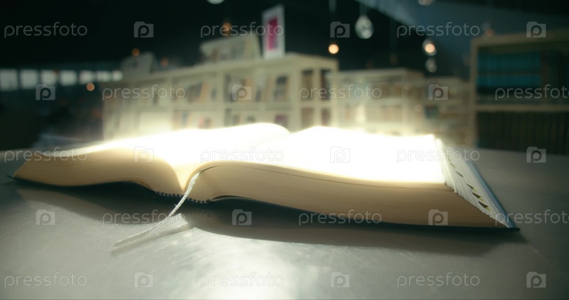 Светящиеся страницы открытой книги крупным планом в замедленном режиме. Чтение концепции знаний. Кинематографический свет в домашней библиотеке. Священные писания Святая Библия