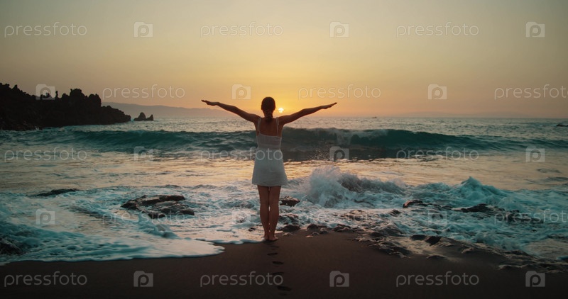 Женский силуэт поднимает руки вверх на пляже с черным песком на закате. Сумерчное оранжевое небо. Взрослая девушка расслабляется, наблюдая за мощными морскими волнами