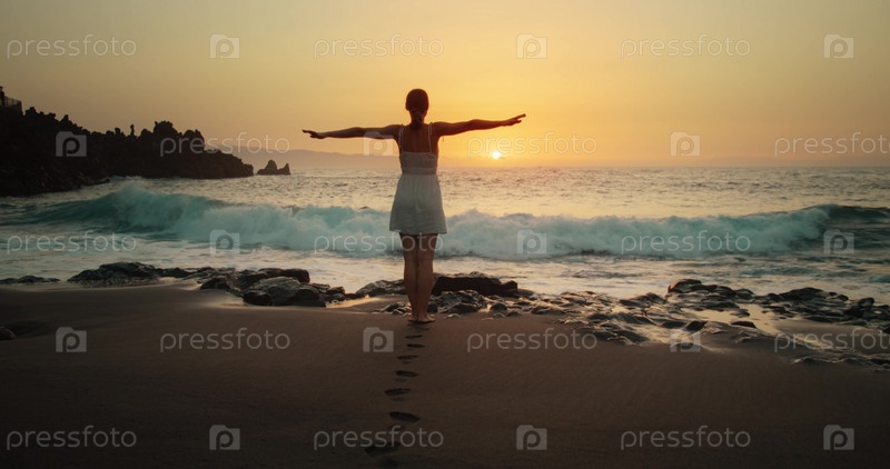 Силуэт женщины на закате, поднимающей руки в воздух. Океанские волны разбиваются о песчаный пляж и разбрызгиваются. Концепция эмоций, радости, счастья