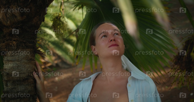 Женщина-путешественница наслаждается прогулкой в тропическом саду, джунглях, лесу с пальмами. Крупный план лица девушки между зелеными пальмовыми ветвями. Замедленная съемка. Иммерсивное путешествие