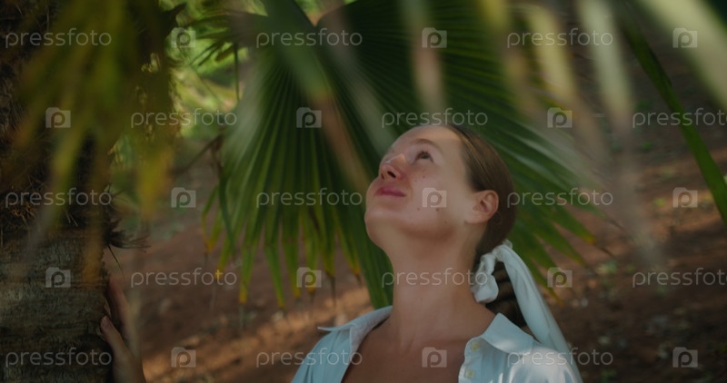 Женщина наслаждается дикой природой среди пальм. Тропический сад, джунгли, лес. Крупный план лица девушки между зелеными ветвями