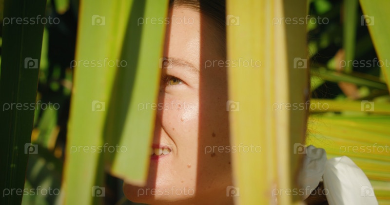 Девушка в тропических зеленых листьях пальмы. Естественная женская красота. Закатный свет и тени на лице крупным планом. Захватывающий опыт путешествий