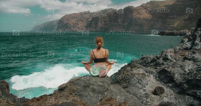 Женщина сидит в позе лотоса и смотрит на поверхность моря со скалистого пляжа. Девушка медитирует на вулканических скалах, Лос-Гигантес, Тенерифе
