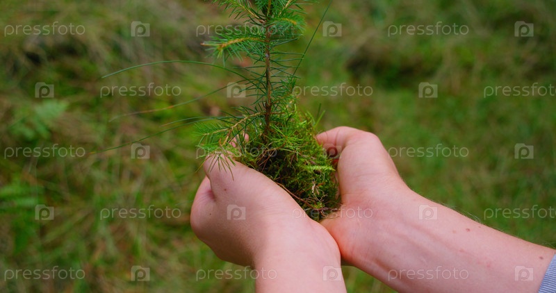 Маленькая ель в человеческих руках на фоне хвойного зеленого леса. Саженец сосны, концепция посадки молодого дерева. Спасти планету