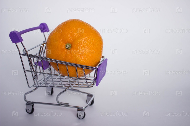 Мини-декоративная тележка с большим оранжевым мандарином на белом фоне. С местом для копирования
