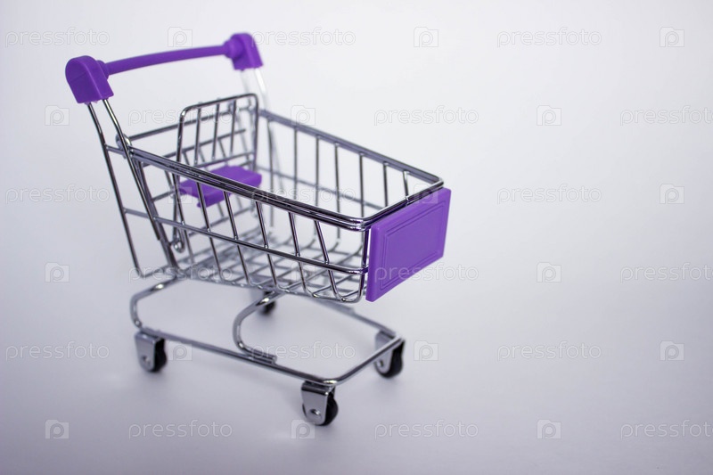 Мини-декоративная пустая корзина для покупок с фиолетовыми элементами на белом фоне с копировальным пространством