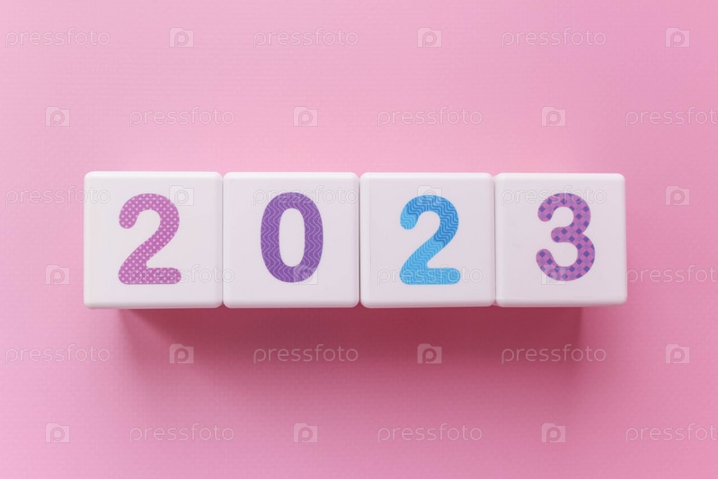 Кубики с красочными цифрами 2023 на розовом фоне. Новый год, календарь. Цифры в ряд