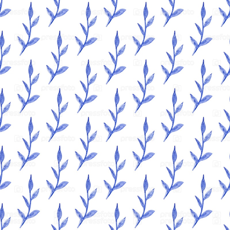 Бесшовный узор с нарисованными вручную акварельными голубыми ветвями с листьями на белом. Органическая, натуральная концепция свежести для текстиля, печати и т. д