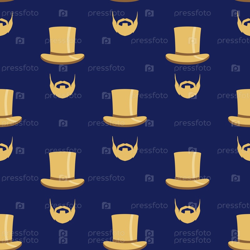 Бесшовный узор со стильным джентльменом в цилиндре и бороде. Модные темно-синие и золотистые цвета