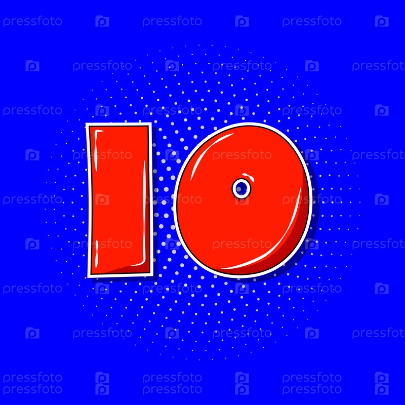Поп-арт красный номер 10 на синем пунктирном фоне. Векторная иллюстрация