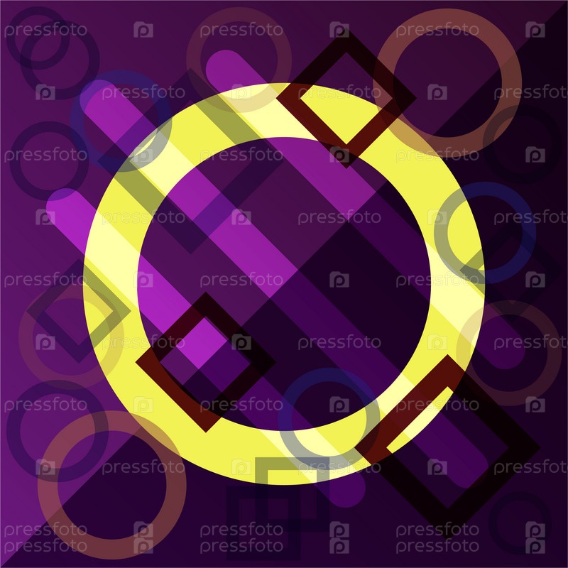 Абстрактный геометрический фон с кругами, квадратами и линиями. Красивая композиция фигур. Желтый, фиолетовый цвета
