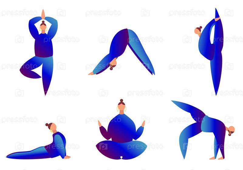 Набор женщин в синей одежде занимается йогой, изолированной на белом. Дерево, собака мордой вниз, кобра и другие позиции. Концепция баланса, здорового образа жизни, спорта, гармонии. Векторная иллюстрация