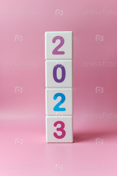 Кубическая башня с красочными цифрами 2023 в центре фотографии на розовом фоне. Новый год, календарь. С местом для текста
