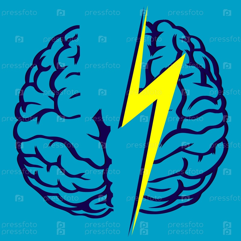 Человеческий мозг расколот на две части молнией. Концепция психического заболевания. Векторная иллюстрация. Разбитый мозг, головная боль