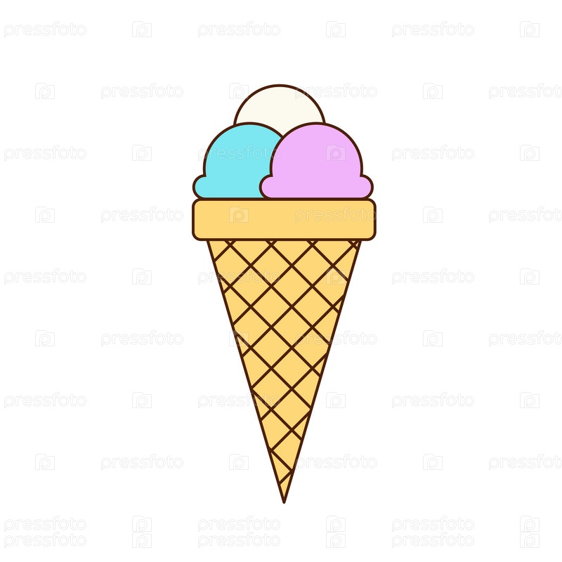 Разноцветные шарики мороженого в конусе, изолированные на белом фоне. Векторная иллюстрация
