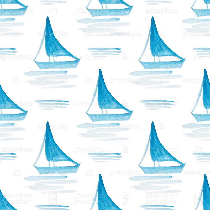 Бесшовный узор с ручной росписью акварелью рисует синюю лодку с парусом, плывущую по морю с волнами. На белом