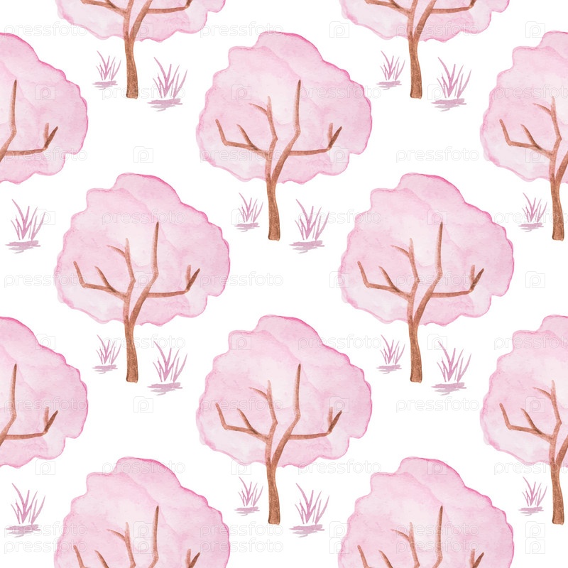 Нарисованное вручную акварельное дерево с пышной розовой листвой и травой на белом. Иллюстрация
