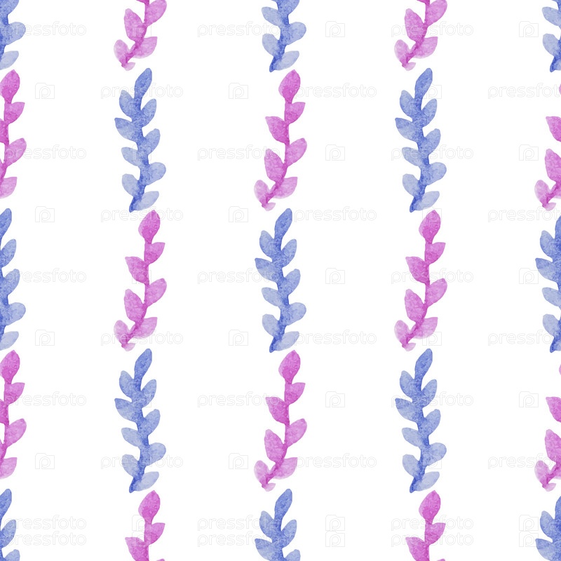 Бесшовный узор с нарисованными вручную акварельными синими и фиолетовыми ветвями с листьями на белом. Лето, весенний сезон