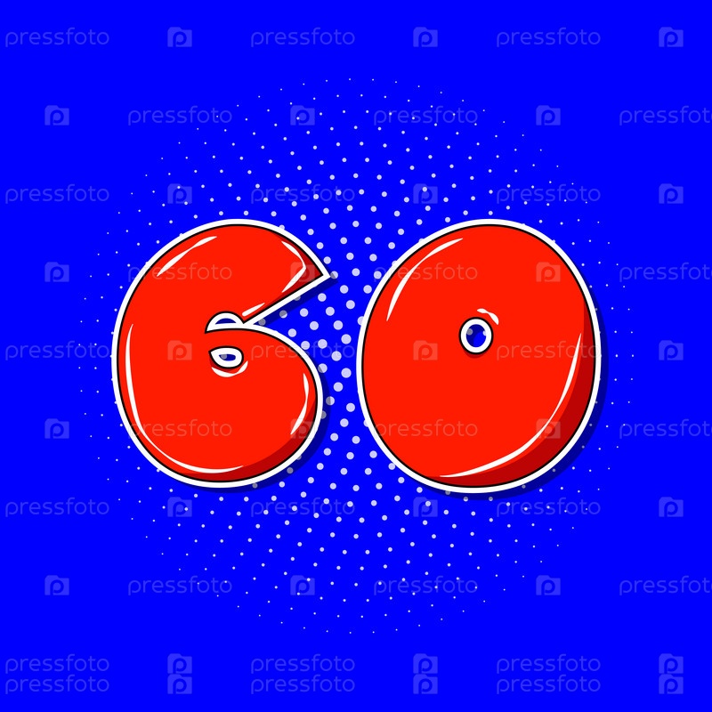 Поп-арт красный номер 60 на синем пунктирном фоне. Векторная иллюстрация