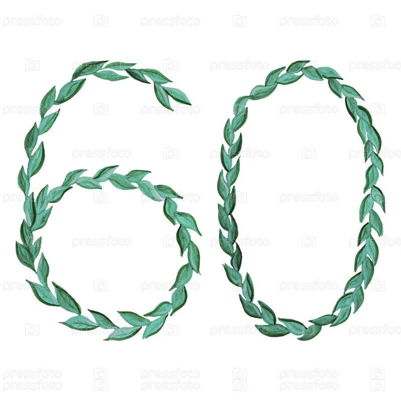 Акварелью нарисован номер 60 из зеленых листьев, выделенных на белом фоне. Цветочный стиль. Векторная иллюстрация