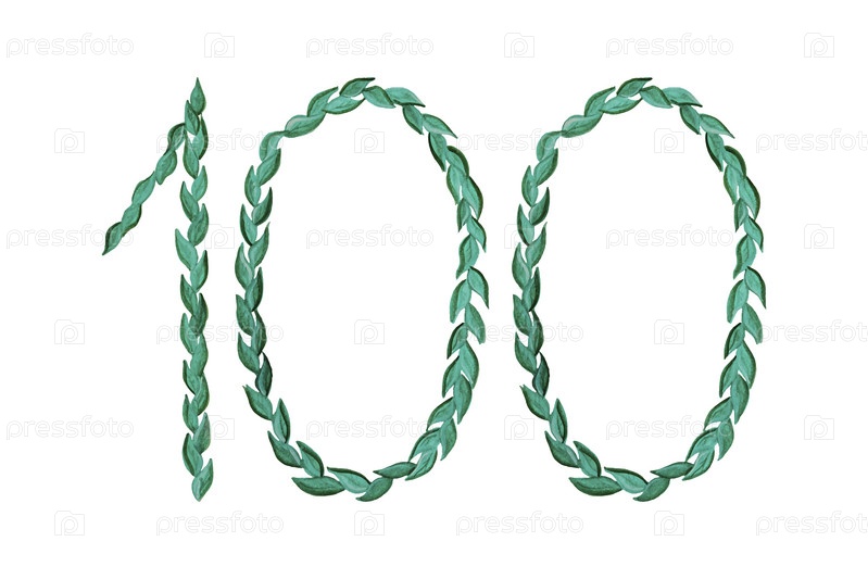 Акварельный рисунок номер 100 из зеленых листьев, выделенных на белом фоне. Цветочный стиль