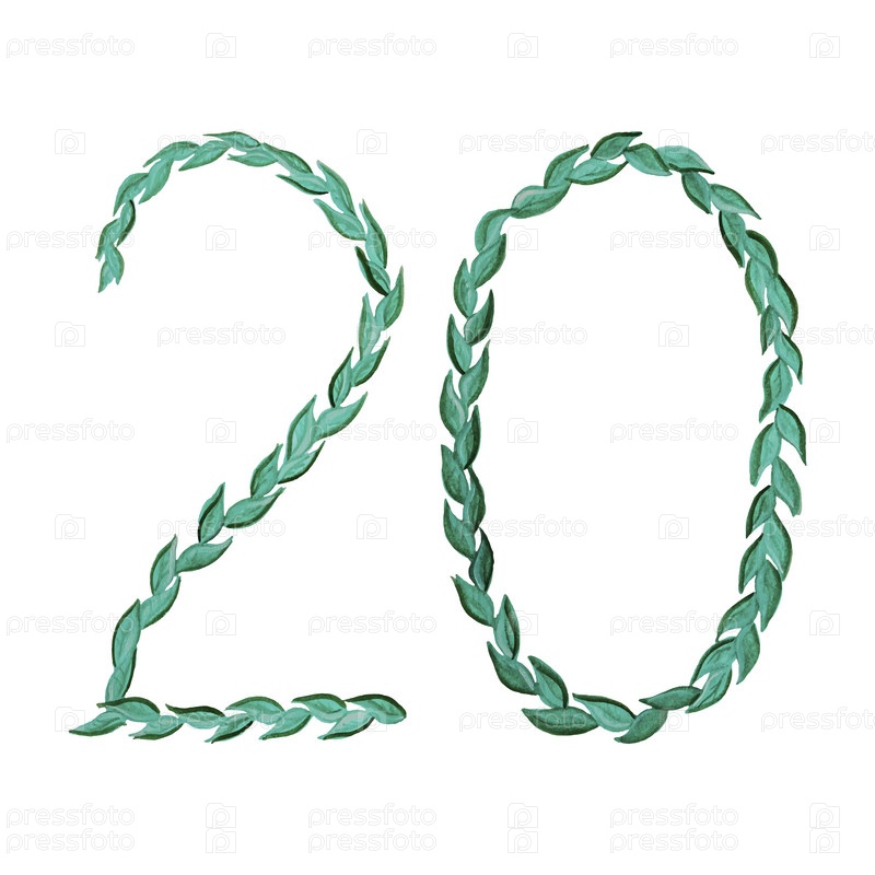 Акварельный рисунок номер 20 из зеленых листьев, выделенных на белом фоне. Цветочный стиль