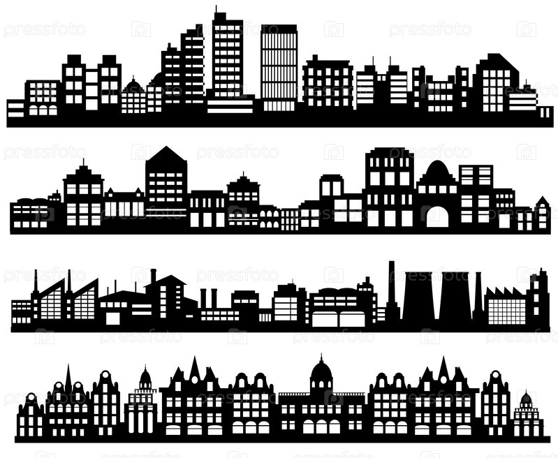 Пейзажный набор зданий, вырисовывающихся на белом фоне. Черные очертания малоэтажных и высотных комплексов и небоскребов. Конструктивные конструкции размещают городские объекты