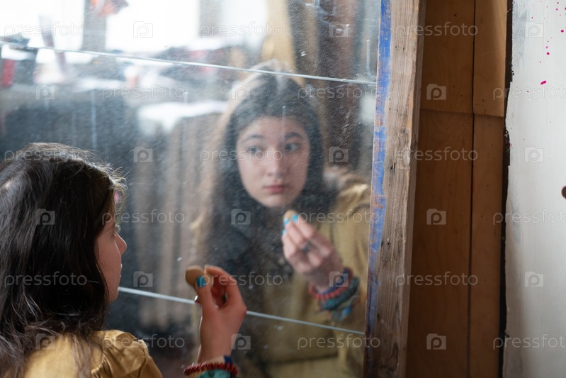 Молодая красивая женщина наносит макияж возле зеркала