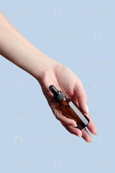 Рука, продукт и сыворотка с женщиной в студии на сером фоне для продвижения антивозрастного лечения. Уход за кожей, красота и бутылка с женской моделью. Макет