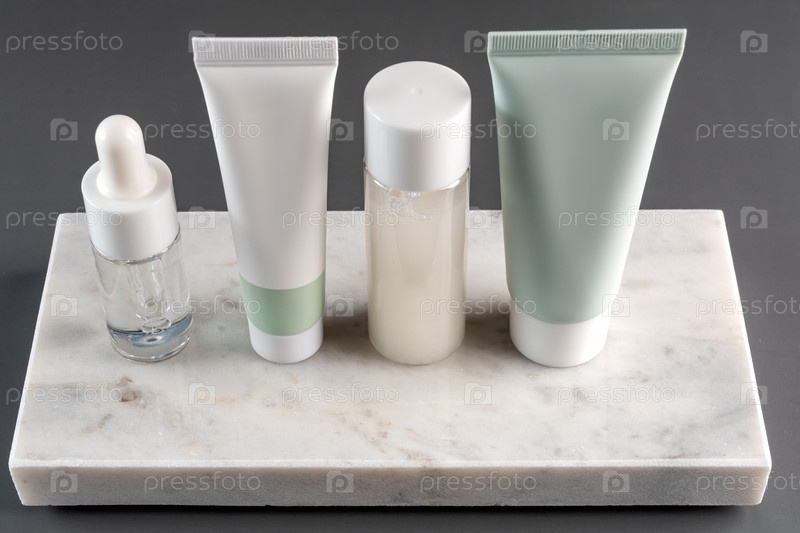 Набор макетов упаковки белой косметической продукции. Профессиональный макет косметического набора для презентации продуктов на мраморном подиуме на черном фоне. Минимализм