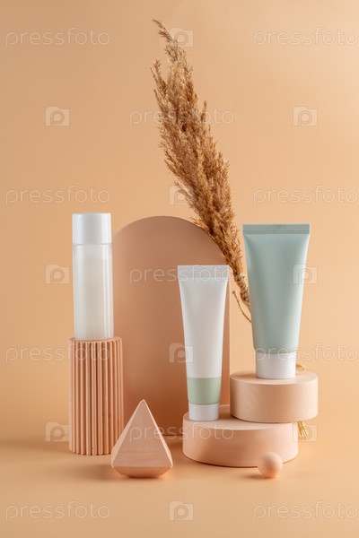 Группа белых и зеленых пустых баночек и тюбиков с косметическим кремом без торговой марки на бежевом фоне на бетонных подиумах. Презентация средств по уходу за кожей. Элегантный макет. Уход за кожей, красота и спа