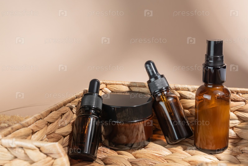 Крупный план коллагенового крема и косметического масла в стеклянной банке и камыша сухих цветов в корзине на бежевом фоне. Набор косметических средств по уходу за кожей и телом