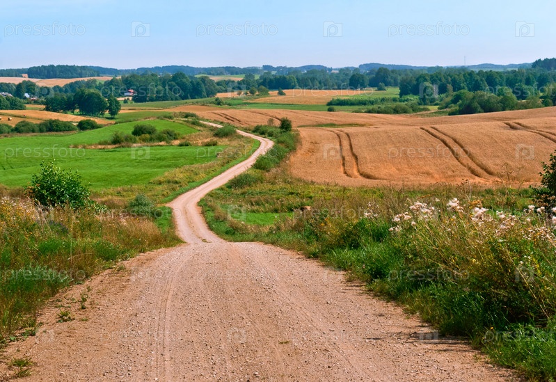 Дорога в поле, грунтовая дорога, вьющаяся между холмами