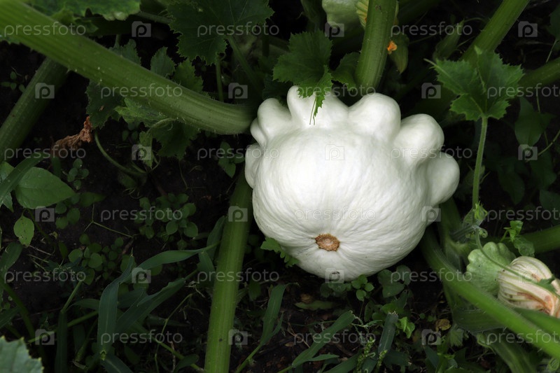 Белый патиссон растет на грядке в солнечный летний день